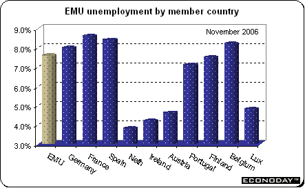 November unemployment rate edged down to a record 7.6 percent from 7.7 percent in the previous month. Unemployment declined in Germany, France and Greece. It should be noted that these data are based on Eurostat's harmonized methodology and do not coincide with national unemployment data. For example, German national data show the November unemployment rate as 10.1 percent, significantly above the harmonized rate of 8 percent reported today.