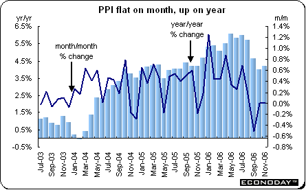 November producer price index was flat on the month and up 4.3 percent when compared with last year. Lower energy prices offset increases elsewhere. Energy prices were down 0.3 percent after declining 0.5 percent in the previous month. Excluding energy, the PPI edged up 0.1 percent and 3.5 percent on the year.