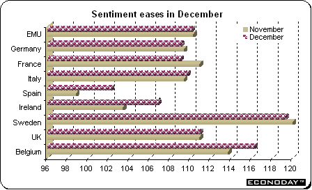 EU - December economic confidence index edged downward to 110.1 from 110.3 in November. Industrial sentiment was unchanged at 6 while consumer sentiment was down a notch to minus 7 from minus 6 in the previous month. Services sentiment was unchanged while retail sentiment deteriorated to zero from plus 3 in the previous month.