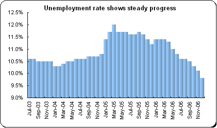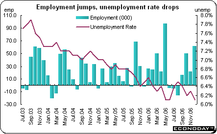 December employment soared by 61,600 jobs. Full time employment was up 36,900 jobs while part time employment increased by 24,800 jobs. The unemployment rate was 6.1 percent, down from November's 6.3 percent rate. Statistics Canada said that employment was up for the 14th consecutive year, increasing by 2.1 percent. Manufacturing employment was up 10,100 in December but was down by 59,000 jobs for all of 2006. The losses were primarily in the main industrial provinces of Ontario and Quebec.