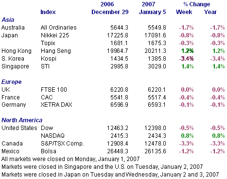 The exuberance of the first day of trading in the New Year quickly dissipated and indexes were down on falling commodity prices, which hurt energy and commodity producers' stocks. Indexes in the commodity countries such as Australia and Canada were hurt. For some indexes, Tuesday's gains were sufficient to absorb declines later in the week. Most were not that lucky. Only the Hang Seng and STI in Asia and the Nasdaq in the U.S. completed the week in positive territory.