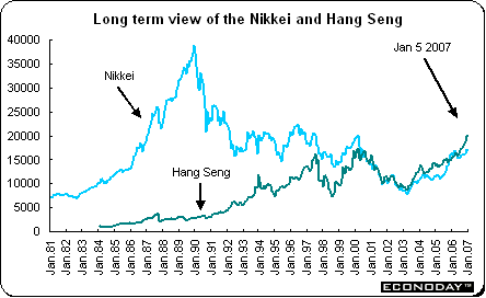 Asian/Pacific stocks ended the week mostly on the downside. But only stocks in Hong Kong and Singapore were up on the week. The Australia's all ordinaries index was hit hard by the declines in commodity prices that affected producers' stocks. In Japan, stocks traded only on Thursday and Friday as markets were closed for traditional New Year's holidays earlier in the week. The graph below pictures the Nikkei since 1981 and the Hang Seng since its inception in 1984. While the Hang Seng has been at or near new long term highs, the Nikkei has a long way to go to equal the ethereal heights of its bubble years.