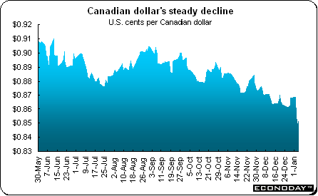 The Canadian dollar fell for a fourth straight month in December and last year saw its first annual decline in five years as the economy slowed and crude oil ended a four-year rally. The currency has dropped about 6.5 percent since its 2006 high of over 91 U.S. cents on May 31st - which was the highest since 1978. The Canadian dollar was trading at 85.3 U.S. cents near today's close.