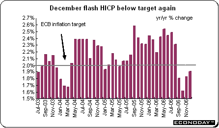 EMU - December flash harmonized index of consumer prices was up 1.9 percent when compared with the same month a year ago. This was the fourth month that the reading came in below the European Central Bank's 2 percent inflation ceiling target. As with all flash reports, no detail was available. The easing of consumer prices has resulted from lower energy prices, but upward pressure on the HICP is expected because of the increase in German VAT that went into effect on January 1, 2007.