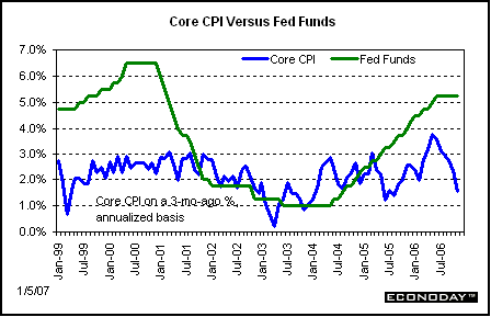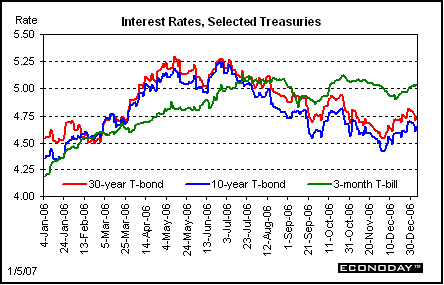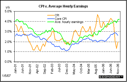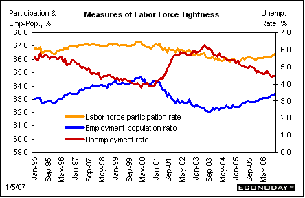 The household survey indicated that labor markets remain notably tight - something that has been a key concern for the Fed. The civilian unemployment rate was unchanged from 4.5 percent in November. Household employment jumped 303,000 in December, following a 286,000 boost in November. Once again, household employment has been stronger than payroll employment. Household survey job growth was 71 percent stronger than payroll growth during 2006. Monthly gains for household survey jobs averaged 262,000 while payroll increases averaged 153 during last year. This still suggests that the economy is stronger than indicated by the more popularly watched payroll survey.
