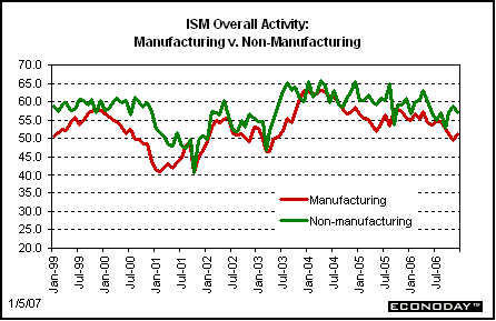 The ISM's non-manufacturing index remained at a healthy level despite marginal slippage to 57.1 from 58.9 in November. New orders, however, edged down a little more in this survey compared to manufacturing, declining to 54.4 in December from 57.1 the prior month.