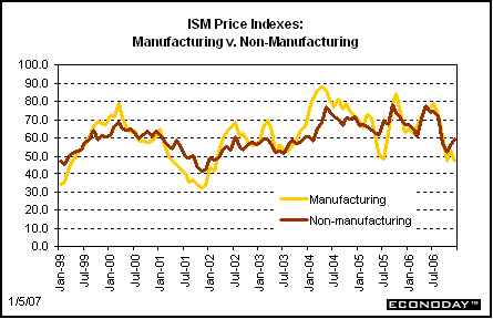 Prices paid were mixed for the two ISM surveys. For the manufacturing survey, prices paid fell to 47.5 in December from 53.5 the prior month. Manufacturing demand for raw materials has weakened notably as is the case for energy goods such as oil. However, prices paid from the non-manufacturing survey rose to 59.1 from 55.6 in November.