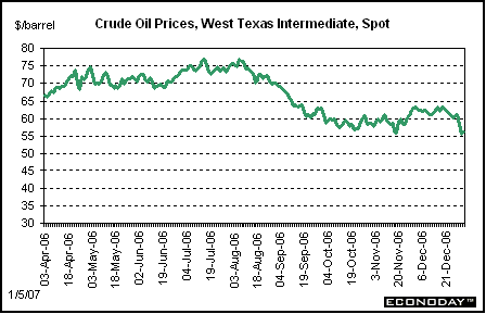 Oil prices ended the week down sharply. Very unseasonably warm weather has caused stocks of heating oil and other refined products to bulge in the U.S. Additionally, the market is pricing in weaker demand due to expected slower economic growth. The strong employment report on Friday helped boost prices somewhat at the end of the week. Spot prices for West Texas Intermediate ended 2006 at $61.05 per barrel. For the first week in 2007, spot prices for West Texas Intermediate ended the week at $56.31 per barrel, down $4.74 per barrel for the week.