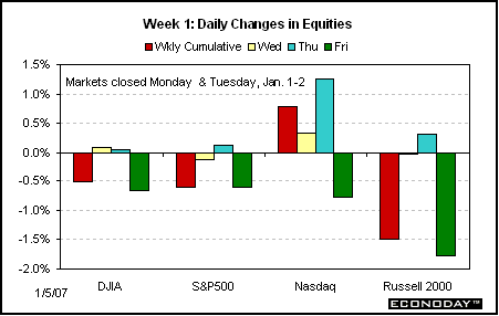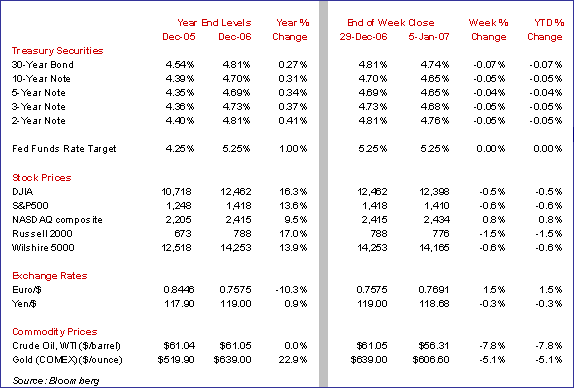 Most stock indexes ended the week down with the Nasdaq being the exception and ending the week up moderately. Stocks made an initial optimistic surge through most of Wednesday - the opening day for last week. Equity markets in the U.S. were closed on Monday for the New Year's Day holiday and on Tuesday for the funeral of former president Gerald Ford. The Dow had broad support with triple digit gains at midday with a positive ISM manufacturing report providing some of the boost. However, when the FOMC minutes for the December 12 policy meeting were released at 2:00 p.m. Wednesday, stock indexes rapidly retreated back to around opening levels - with the Nasdaq being the exception. The FOMC minutes stated continuing concern by the Fed over inflation remaining too high but now with some FOMC members worrying about too weak economic growth. This combination was seen as the worst combination for stocks. Big news for the day also included the announcement of the resignation of Home Depot's Chief Executive Officer Robert Nardelli - which sharply boosted Home Depot stocks. On Thursday, most equities moved sideways with the markets waiting on Friday's employment report. However, the Nasdaq posted a strong 1.2 percent gain on Thursday, led by technology stocks. All major indexes fell sharply on Friday as the strong employment report caused the markets to push back when they expect the Fed to cut interest rates.