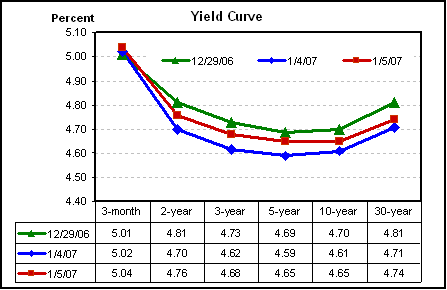 Net for the week the Treasury yield curve is down only marginally but with the front end up incrementally. Otherwise, yields were down net 4 to 7 basis points. Yields were down as follows: 2-year Treasury note, down 5 basis points; 3-year, down 5 basis points; 5-year, down 4 basis points; the 10-year bond, down 5 basis points, and the 30-year bond, down 7 basis points. The 3-month Treasury bill was up 3 basis points.