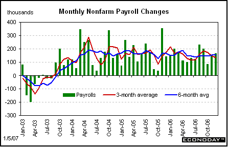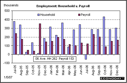 Importantly, the payroll data go through a number of revisions since the initial payroll data on based on business establishments in the Labor Department's sample. During the first year of estimates, the Labor Department has no actual data on births of new firms and has to estimate growth rates for new firms. Sometimes those forecasts miss significantly and that may have been happening over 2006 since there is such a wide difference between the payroll numbers and the household job gains. Of course, the household numbers also pick up the self-employed while the payroll figures do not. The household employment figures are based on a smaller sample but have no forecast portion in the initial year.