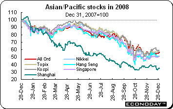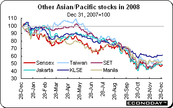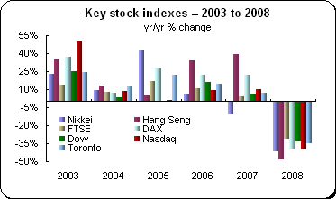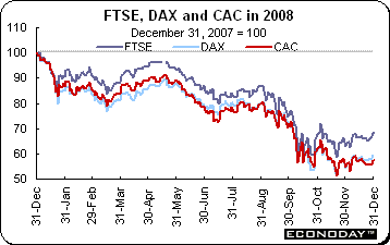 Among the main equity markets, the Nikkei sank 42.1 percent, eclipsing the loss in 1990 of 38.7 percent. The FTSE’s 31.3 percent loss ranks as its worst year since the index was created in 1985 and easily eclipses 2002’s loss of 24.5 percent. But to put this loss in some perspective — the FTSE was the second best performer of the indexes followed here and dramatically illustrates the scope of the declines elsewhere.