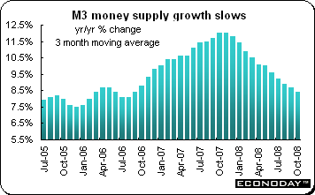 M3 money supply growth eased to 8.4 percent from 8.7 percent for the three months ending in November when compared with the same three months a year ago. For November, M3 growth was 7.8 percent when compared with last year and down from 8.7 percent in October. The deceleration was mirrored in the key private sector lending counterpart which saw its 12-month growth rate decline from 7.8 percent to 7.1 percent. In part this deceleration reflects further hefty sales of loans by financial institutions within the monetary sector to those outside.