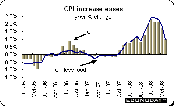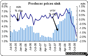 November producer prices dropped 1.9 percent and were up 1.6 percent when compared with a year ago. The slide in prices was once again led by cheaper energy costs which were down 7.1 percent on the month. Excluding energy, prices dropped 0.5 percent and were up 2.4 percent on the year. Autos (0.6 percent) were the only sector to see a monthly increase in prices. Declines were led by intermediates (1.3 percent) and agriculture (0.6 percent). Capital goods prices edged down 0.1 percent, as did prices for consumer goods.
