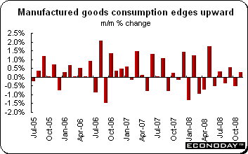November consumption of manufactured goods was up 0.3 percent and 1 percent when compared with last year. The advance occurred despite a 2.1 percent monthly slide in auto purchases and a 1.0 percent drop in sales at textile stores. Losses here were more than offset by a 3.4 percent bounce in spending on household goods combined with more modest increases of 0.6 percent in purchases of durables and of 0.5 percent in buying of other products. Excluding autos and related parts, spending was up 0.6 percent on the month.