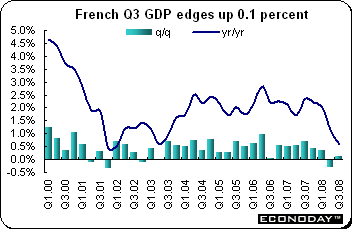 Third quarter gross domestic product was up an unrevised 0.1 percent and 0.6 percent when compared with the same quarter a year ago. What meager growth there was occurred mainly in the public sector which was up 0.6 percent from the previous period. Household consumption edged up only 0.2 percent while gross fixed capital formation edged downward by 0.2 percent. Total domestic demand grew 0.2 percent.