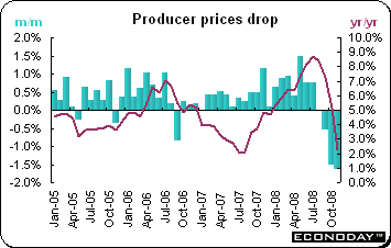 November producer price index tumbled 1.6 percent and was up 2.3 percent when compared with last year. The monthly decline was led by coke & petroleum products where prices dropped 13.1 percent. Weakness was compounded by a 2.6 percent decline in the cost of metals (2.6 percent) and much smaller declines in electrical machinery (0.8 percent), food & drink (0.5 percent), wood (0.3 percent) and paper & paper products (0.3 percent). Overall manufactured goods prices dropped 2.0 percent on the month while minerals were down 0.9 percent.