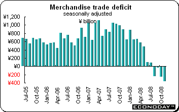November merchandise trade balance was in deficit for the fourth month. The deficit was ¥223.4 billion compared with a surplus of ¥784.4 billion in the same month a year ago. On the year, exports were down 26.7 percent while imports tumbled 14.4 percent. Exports to the U.S. plummeted by 33.8 percent on the year while imports from the U.S. sank by 17.8 percent. Exports to Asia dropped 26.7 percent while imports from Asia were down 12.5 percent. In Asia, exports to China sank 24.5 percent while imports from China were down 12 percent. Moving to Europe, there too, exports to the EU sank 30.8 percent while imports from the area dropped 20.8 percent.