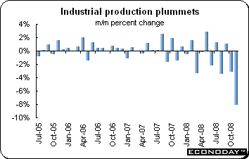 November industrial production plunged a record 8.1 percent on the month and was down 13.3 percent when compared with last year. The monthly drop was the biggest since the government began releasing comparable data in 1953. The November decline in manufacturing output coincided with a record 26.7 percent on-the-year drop in exports. Industries that mainly contributed to the decline were transport equipment, general machinery and electronic parts & devices. Commodities that declined were large passenger cars, large trucks and drive transmission and control parts.
