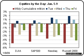 Markets primarily focused on the Friday jobs report and President-elect Obama’s speech on his fiscal stimulus plan. Equities prepped for Friday’s employment losses on Wednesday with a deeply negative ADP employment report with stocks nose-diving for the day. Obama’s speech the next day was hoped to be heavy on cheerleading but instead turned out to be a dose of both hope and reality. Obama presented a broad picture of a massive stimulus plan but also stated that the worse is yet to come for the current recession. Stocks were mixed for the day after the president-elect’s comments on Thursday. Friday’s job losses were near expectations but many saw the detail as indicating that weakness is greater than believed – especially after numerous companies lowered revenue guidance.