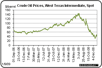 This past week, oil prices responded to economic data the way most commodities do —sharply. The biggest factors were a larger-than-expected rise in inventories on Wednesday and a huge plummet in payroll jobs on Friday (along with the spike in the unemployment rate). As usual, commodities prices swing more than the overall economy and oil prices fell a sizeable $5.33 per barrel on Wednesday for spot West Texas Intermediate and by $2.20 per barrel on Friday. Recession is wreaking havoc on oil prices. The fact that prices are down despite Israeli military action in the Gaza Strip and the war of words (and supply) between Russia and the Ukraine on natural gas speaks volumes on the extent of global economic weakness.