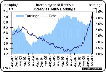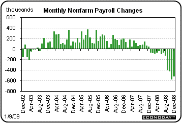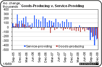 The December employment report shows the recession worsening. This is seen in the fact that job losses were much worse in the second half of 2008 than the first—1.7 million versus 0.9 million. This will keep the consumer sector very much in a defensive mode – which is not good news for the economy. The sharp job cuts will spill over into weaker or even negative income growth and then a further drop in consumer spending. The fourth quarter damage is still spreading.