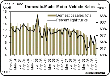 Heavy discounting and lower gasoline prices helped nudge up motor vehicle sales in December – but not as much as needed. Car and light truck sales were extremely weak in December but not quite as weak as November. Unit sales of North American made vehicles in December edged up to a 7.7 million annual rate, next only to November as the lowest rate in 20 years of records. The continued softness in sales reflects a declining jobs market, tight credit, and fears that U.S. automakers could still end up in bankruptcy. Overall, the year 2008 was quite ugly for U.S. producers. Year-ago totals were down as follows: General Motors, down 22.7 percent; Ford, down 20.5 percent; and Chrysler, down 30.0 percent. The sluggish sales pace has inventories still quite high – meaning automakers will be keeping assembly lines shut much longer than usual after holiday shutdowns.
