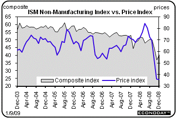 The non-manufacturing sector continued to decline in December but not as rapidly in November. The ISM non-manufacturing composite index edged up a little over 3 points in December to 40.6. But this level is still well below the breakeven point of 50, indicating that many more purchasers are reporting contracting conditions than expanding conditions.