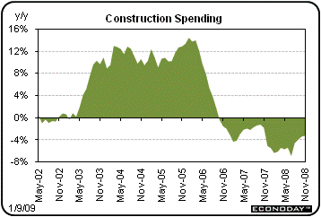 On a year-on-year basis, overall construction outlays were down 3.3 percent in November. Overall, the latest construction outlays report shows housing continuing to deteriorate with public and nonresidential construction at least temporarily softening the housing blows on the economy. But the positives are not likely to last. Problems with retail sales and weak demand for office space suggest a weakening in nonresidential outlays while budget problems for states indicate a reduction in public outlays. However, fiscal stimulus could boost public outlays but not immediately. But for the near-term, construction is likely to worsen.