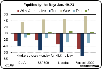 Stocks got no bounce from Obama taking office this past Tuesday. While there is considerable opinion that the new administration’s expected fiscal stimulus plan will speed up recovery, the latest earnings reports more than offset that optimism. Equities were pulled in particular by financials. Lowlights included huge losses at Royal Bank of Scotland. RBS warned that it may report a loss of $41.3 billion.