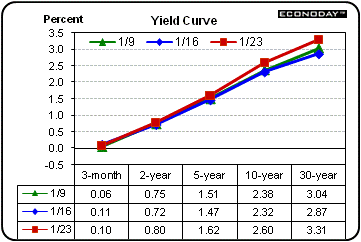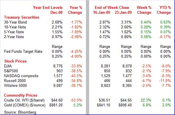 Current monetary policy and expected fiscal policy played key roles in the bond markets this past week. The Fed is keeping short-term rates extremely low with the fed funds target range of zero to 0.25 percent. Treasury bill yields remained not far from zero in sympathy with the fed funds rate. In contrast, with Barack Obama taking office this past Tuesday, credit markets have become more nervous about how much debt the U.S. government and governments world wide will be issuing to combat recession. Hence, the long-bond rose sharply this bond week with rising inflation fears also contributing to the boost in long-term yields.