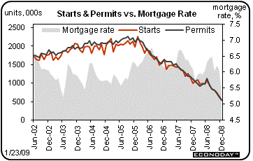 Other housing news out last week point to continued weakness or even further deterioration. The housing market index, compiled by the National Association of Homebuilders together with Wells Fargo, fell 1 point in January to a record low of 8 -- a level indicating that nearly all respondents are reporting month-to-month contraction. This index compiles respondents’ views on present sales of new homes, sales of new homes expected in the next six months, and traffic of prospective buyers in new homes.