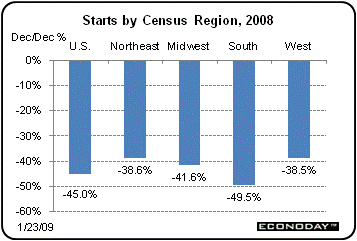 By region, the decline in starts was led by a monthly 24.5 percent drop in the Midwest. Starts also declined in the South, down 22.2 percent, and the West, down 2.2 percent. The Northeast rose 12.7 percent.
