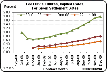 Indeed, the fed funds futures market was paying attention to the statement. Based on fed funds futures, traders expect the effective fed funds rate to stay below 0.25 percent at least through mid-2009 and below 0.5 percent for the rest of 2009.