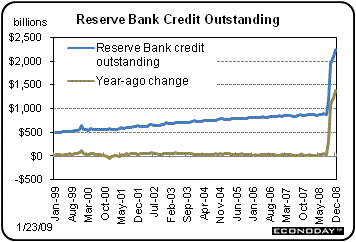 Over the past decade from 1999 until late 2008, Reserve Bank credit outstanding had been slowly rising from $500 billion to $1 trillion. But credit outstanding surged from $894 billion this past September to an astonishing $2.2 trillion in December! Now, the focus is expanding credit into specific segments of the credit markets that will have the most impact on economic recovery. The Fed emphasized this targeting of credit in the December FOMC statement.