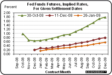 Probably the market that focuses the most on Fed policy is the fed funds futures market. Here, traders are making bets on what the fed funds rate is going to be in coming months. At the December 15-16 FOMC meeting, the Fed slashed its target rate down to a range of zero to 0.25 percent—bringing the target in line with an effect fed funds rate that for weeks had been trading at about 0.10 percent. In the meeting statement and in later released minutes, the Fed said it was going to keep the policy rate at then current levels “for some time.” Since the meeting, Fed officials have indicated that the economy worsened in the fourth quarter and will likely contract significantly in the first. So, what does the fed fund futures market think about near-term fed policy—does the market believe the Fed’s word'