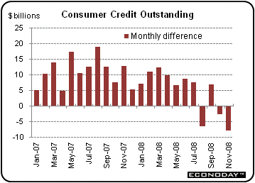 Have credit markets been lending to consumers' Have Fed policies trickled down to the consumer' Unfortunately, the answer is no. Consumer credit posted a record decline of $7.9 billion for November -- the third decline in four months. Revolving credit fell $2.8 billion, or 3.4 percent in the month, while nonrevolving credit fell $5.2 billion, or 3.9 percent. It is extremely unusual for outstanding credit to outright decline – as opposed to gains merely slowing. Even on a year-ago basis, credit growth has hit the brakes. The year-ago pace is down from a recent high of 5.8 percent for October 2007 to 2.3 percent for the latest month. The recent downward trend likely reflects both credit card companies and other lenders tightening credit standards and also consumers pulling back on spending due to recession concerns. The Fed is establishing special credit facilities to address consumer credit difficulties. This could be one of the big issues at this week’s FOMC meeting.
