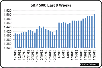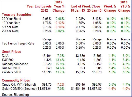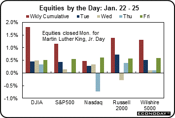 In a shortened trading week for Monday's Martin Luther King, Jr. Day, equities generally posted net weekly gains for the fourth week in a row. The week got off to a good start on Tuesday due to better than anticipated earnings and on indications that Republican leaders in the U.S. House of Representatives planned to pass a nearly four-month extension of the U.S. debt limit. These outweighed slippage in December existing home sales but from a relatively strong pace in November. On Wednesday, equities gained on news after Tuesday's close of stronger-than-expected profits for IBM and Google. Also, the economic news was favorable with a notable gain in the FHFA home price index. Also, helping to lift stocks, the U.S. House of Representatives actually did pass a plan to suspend the country's debt ceiling until May 19th with Senate and presidential approval expected early this coming week.