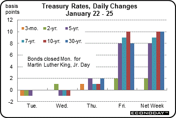 For this past week Treasury rates were up as follows: the 2-year note, up 2 basis points; the 5-year note, up 8 basis points; the 7-year note, up 9 basis points; the 10-year note, up 10 basis points; and the 30-year bond, up 10 basis points. The 3-month T-bill was unchanged.