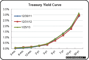 Economic indicator news had next to no impact on Treasury yields this past week. But rates for the week were up moderately with the only notable move taking place Friday. Two factors came into play. Traders re-evaluated equities as a better bet as the S&P 500 topped the 1,500 mark. Also, yields rose on reversal of flight to safety on news from the European Central Bank that banks will repay €137.2 billion ($184.4 billion) of €489.2 billion outstanding in early repayment of the first 3-year Longer-Term Refinancing Operations, a total that topped median market expectations. Traders ignored the decline in new home sales for December as an aberration in the underlying trend for improvement in housing.