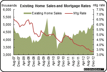 Lack of homes for sale, especially at the low end, are holding down sales of existing homes which were down 1.0 percent in December, but followed a 4.8 percent surge in November. December’s annual rate of 4.94 million was still up 12.8 percent on a year-ago basis.