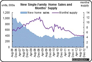 But mortgage rates are definitely supporting sales. According to the Federal Home Loan Mortgage Corporation, rates on 30-year conventional loans averaged 3.35 percent in December. This is sharply lower than the roughly 6-1/2 percent seen during the height of the last housing bubble. The Fed’s Operation Twist (which ended in December) clearly had impact on lowering rates. The Fed’s QE4 is acting as a substitute for Operation Twist and is keeping downward pressure on rates.