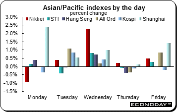 Investors were bombarded with economic data at week’s end with many indicators giving their first glance at January. And what investors saw were indications that the global economy was improving — especially in China and the U.S. and even in the Eurozone. For January, only the Kospi and KLCI declined. However, the picture for the week was decidedly mixed.