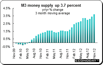December M3 money supply was up 3.3 percent from a year ago. The ECB’s favored 3 month moving average measure accelerated to 3.7 percent when compared with the same three months a year ago. However, private sector borrowing remained very subdued with lending down 0.7 percent on the year. Borrowing by households was up a sluggish 0.5 percent. Within this, loans for house purchase grew 1.3 percent. Lending to non-financial corporations weakened further, declining 2.3 percent from December 2011 following a 1.9 percent drop last time. Loans to non-monetary financial intermediaries were up an annual 0.7 percent, after a 1.4 percent drop in November.