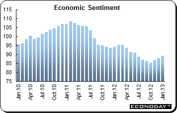 January economic sentiment index posted a third successive increase, rising a modest 1.4 points and left the headline measure at 89.2, its highest level since June last year. The index reflected reassuringly widespread, if small, improvements across all of the major sectors. The strongest increase in morale was seen in construction followed by consumers. But industry only edged a little higher. Retail was similarly little changed and services gained just a point. However, hiring prospects were slightly better in all areas. Regionally among the larger member states, Germany (2.5 points) registered the most significant advance in confidence and although Spain (0.5 points) made some headway, Italy was unchanged and France (minus 0.3 points) declined. Once again, only Estonia was above the 100 long-run average.