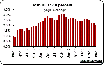 January flash harmonized index of consumer prices eased to 2.0 percent from 2.2 percent in December when compared with a year ago. Softer energy inflation, which declined 1.2 percentage points to 3.9 percent, will have helped to dampen the overall picture but there were promising signs elsewhere too. In particular, non-energy manufacturing product prices were up 0.8 percent on the year after a 1.0 percent increase last time while inflation in services decelerated from 1.8 percent to 1.7 percent. Charges for food, alcohol & tobacco maintained a 3.2 percent annual rate.