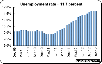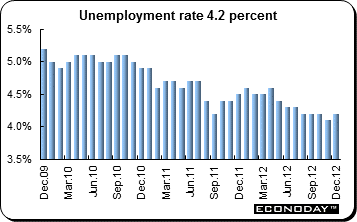December unemployment edged up to 4.2 percent from 4.1 percent the month before. This is the lowest rate since 2008 when the rate was 4.0 percent. The number of unemployed persons was 2.59 million, a decline of 170,000 or 6.2 percent from the previous year. For the year 2012, the unemployment rate was 4.3 percent compared with 4.6 percent in 2011. The number of employed persons was 62.28 million, a decline of 380,000 or 0.6 percent from the previous year.