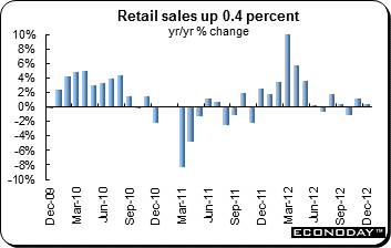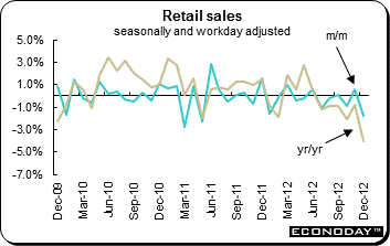 December retail sales dropped 1.7 percent for the fourth time in six months after increasing 0.6 percent in November. On the year, sales dropped 4.7 percent. The December data left purchases at their weakest level since May 2011 and made for a quarterly contraction of 1.1 percent following a 0.9 percent slide in the previous period.