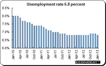 January joblessness followed December's marginally smaller revised 2,000 decline with a surprisingly sharp 16,000 drop. The number of people out of work now stands at 2.916 million. The unexpected decline was large enough to reduce the unemployment rate from 6.9 percent to 6.8 percent. The cumulative decline in joblessness over December and January effectively reverses the increase seen in October/November and suggests that the labour market is holding its own. Vacancies dipped 1,000 at the start of the year but this was still an improvement from the 4,000 slide posted last time. The latest unemployment figures follow the earlier release of the December ILO report which revealed a 22,000 increase in payroll employment, up 1,000 on November's advance and a more marked improvement over the previous three months which saw an average gain of just 5,000.