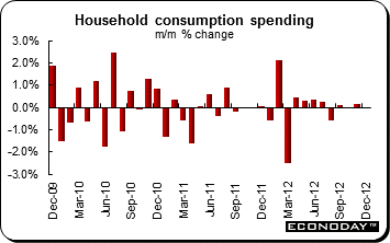 December household spending on manufactured goods increased 0.3 percent on the month following a marginally smaller revised 0.1 percent drop in November. On the year, purchases were 0.6 percent below their level in December 2011. The latest gain was largely attributable to the auto sector which saw sales jump 4.6 percent from November as consumers brought forward their purchases in anticipation of higher pollution taxes at the start of 2013. However, household goods were down 0.4 percent on the month, textiles off 0.6 percent and other products just flat.